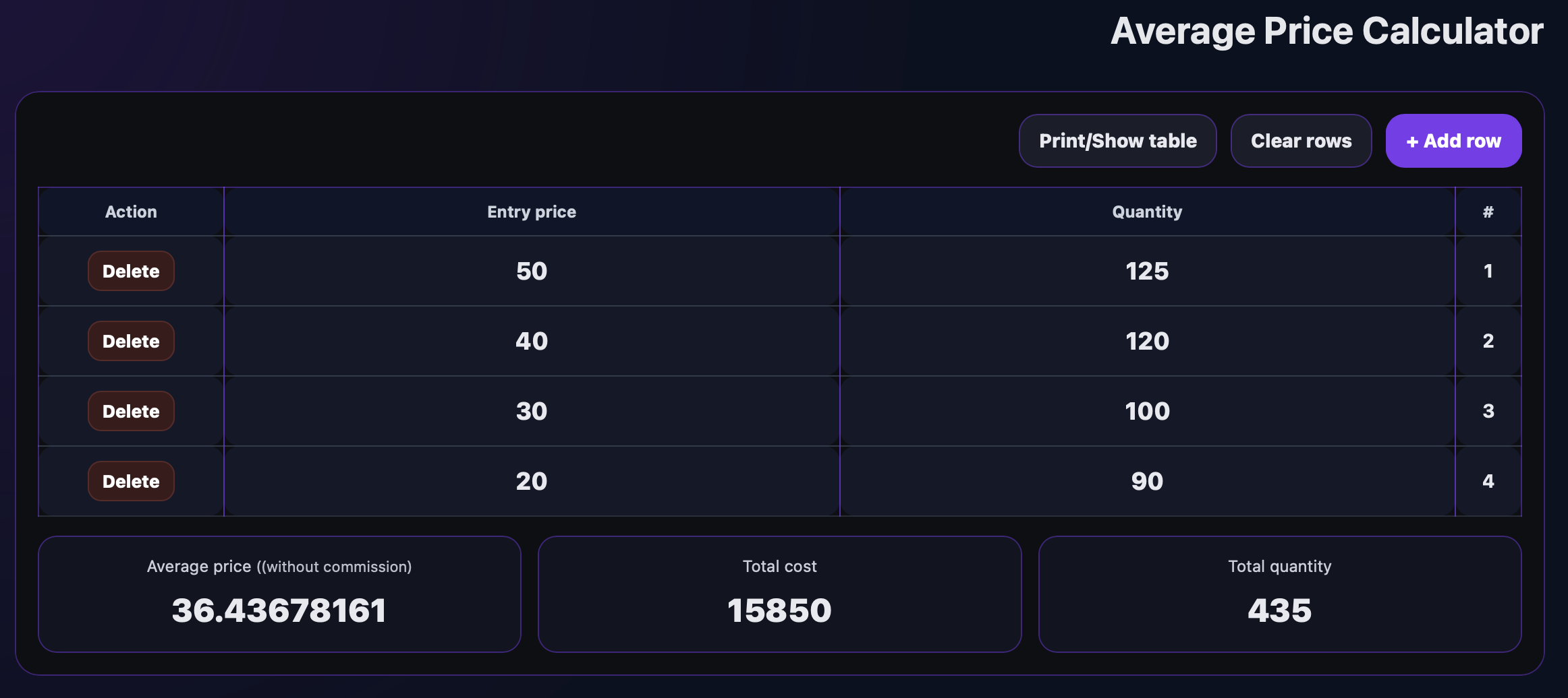 This calculator helps you determine your real average entry price after multiple buy orders of the same asset, while instantly showing total quantity and total cost.